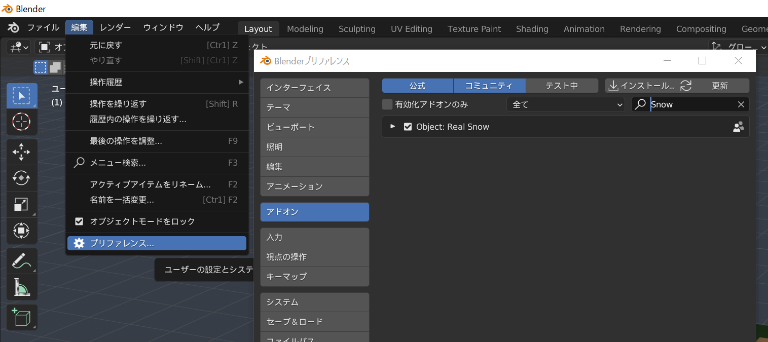 いつも通りアドオンを有効にするため、編集→プリファレンス→アドオン