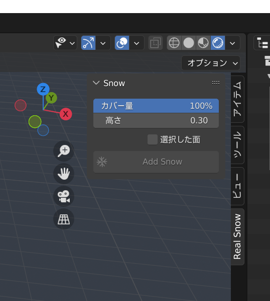 Nキーを押すとビューの横に展開された「Real Snow」タブを開きます。