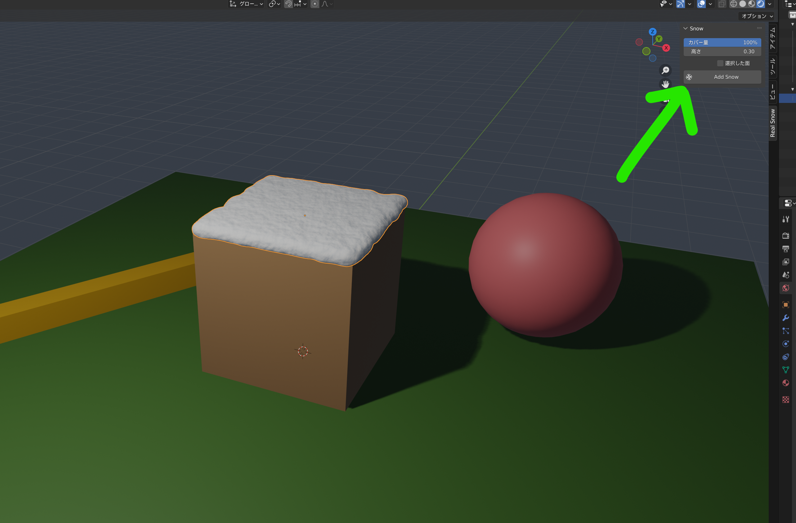 積もらせたいオブジェクトを選択し、カバー量と高さの調整後「Add Snow」で押すと選択したオブジェクトに雪が積もります。