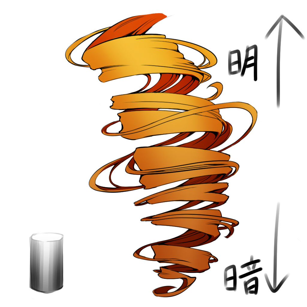全体的には円柱の形を考えながら陰影を入れていきます。