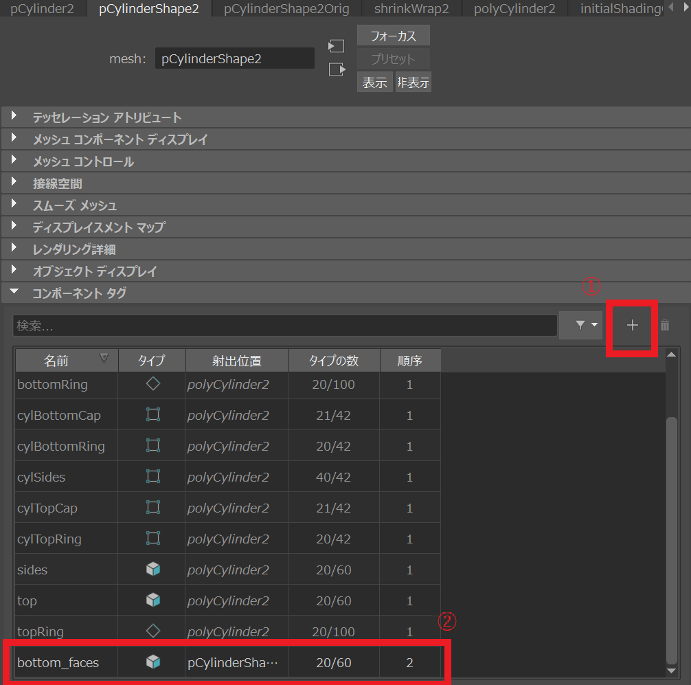 ・アトリビュートエディタ>pCylinderShape>①コンポーネント タグに追加します。