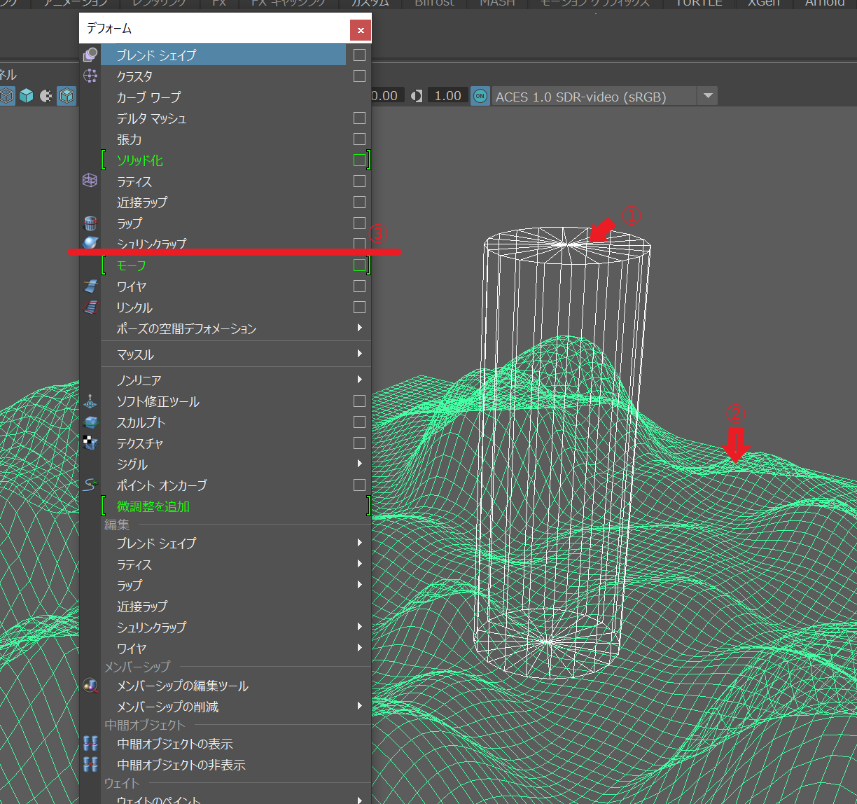 ・①円柱を選択して、②地面のオブジェクトを選択する>デフォーム>③シュリンクラップをクリックします。