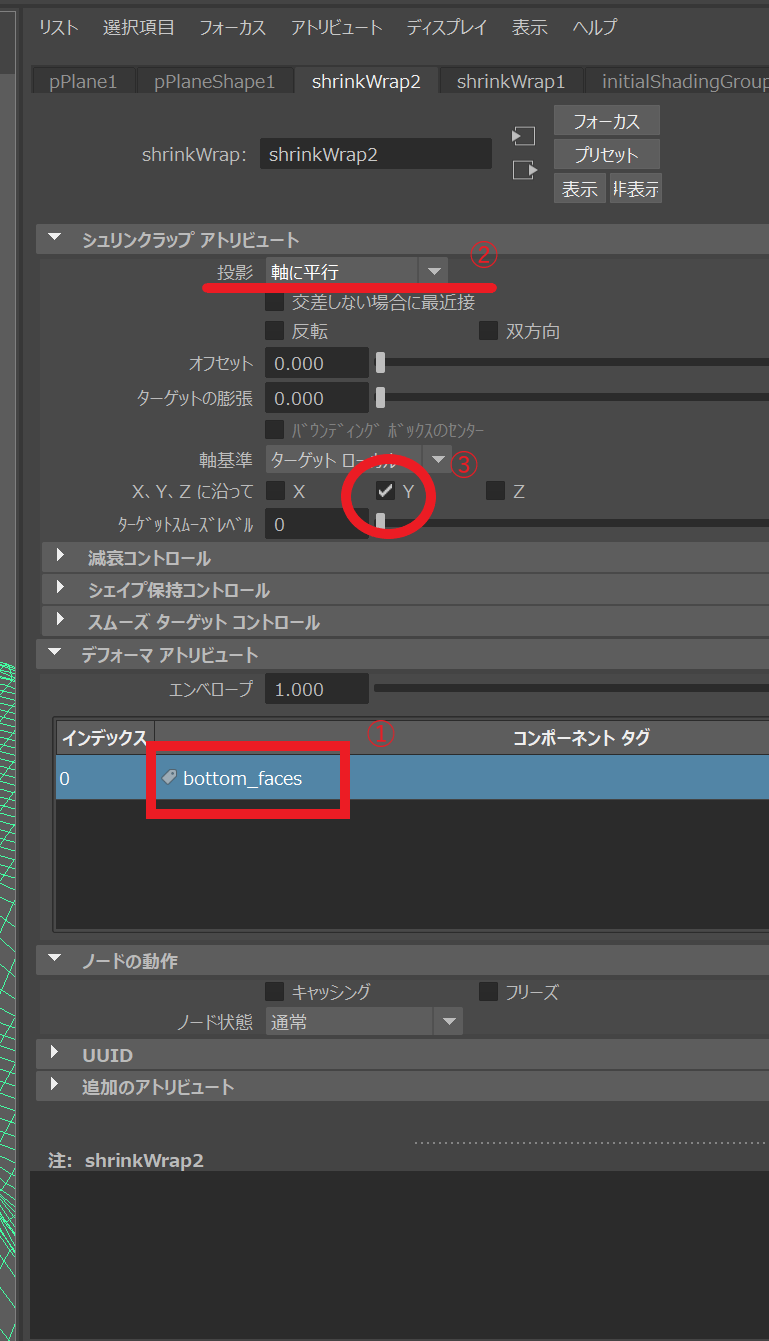 デフォーマ アトリビュートを開いて、①コンポーネント タグを先ほど追加した名前と同じになるよう「bottom_faces」に変更します。