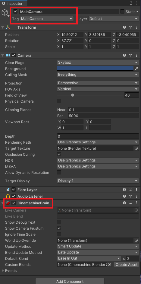Cinemachine Brainはカメラ自体に含まれるコンポーネントです。