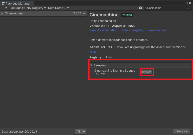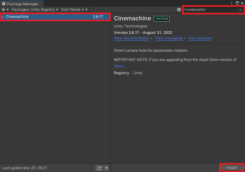 Window -> Package ManagerからCinemachineと検索してインストールします。