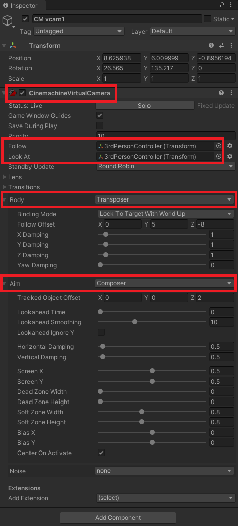 とりあえず、BodyをTransposerに、AimをComposerに設定して動作を確認しましょう。