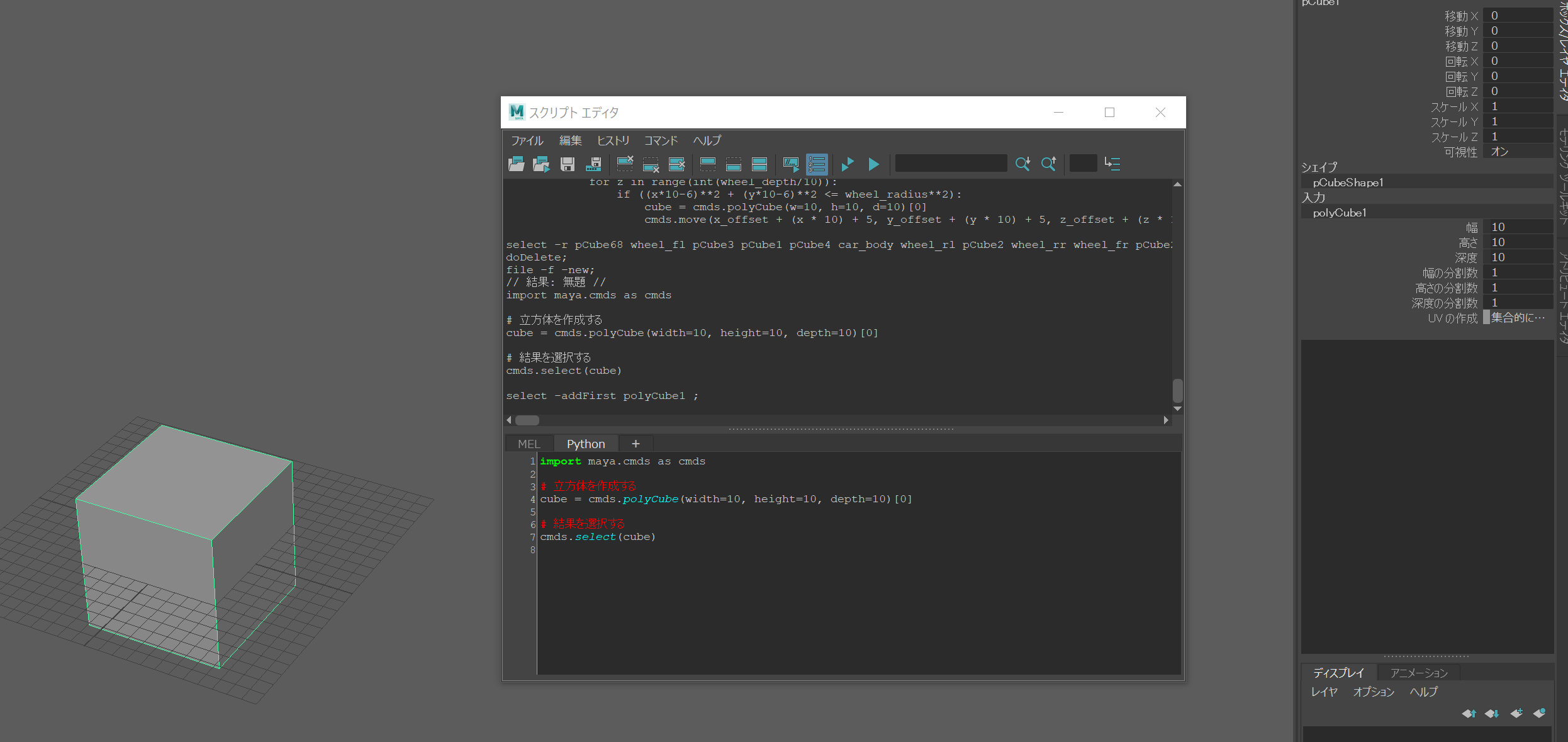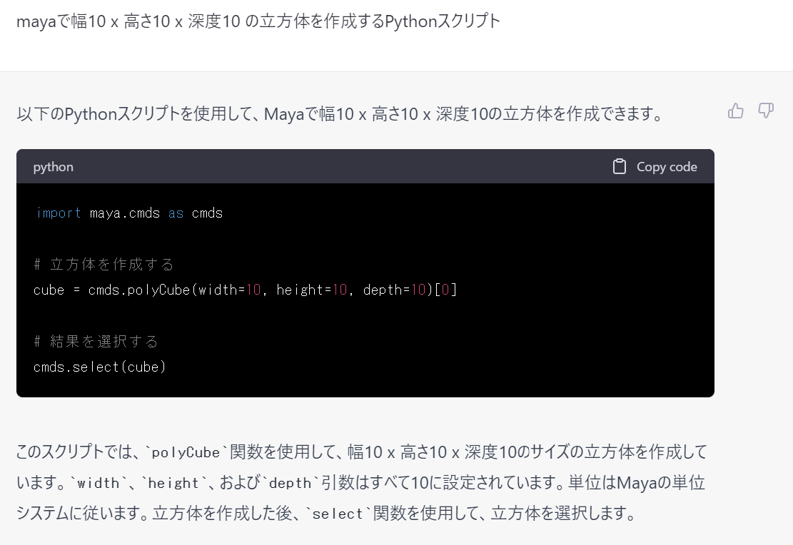 「Mayaで幅10 x 高さ10 x 深度10 の立方体を作成するPythonスクリプト」